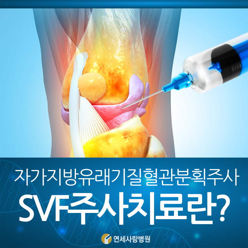 인공관절수술은 연골이 모두 마모 된 단계인 말기에 적용하는 것이 일반적이지만, 연골이 모두 마모되기 전 단계에는 다양한 치료 방법을 적용할 수 있습니다. 오늘은 그 중에서도 SVF주사치료, 즉, ‘자가지방유래 기질혈관분핵’ 주사에 대해 말씀 드리도록 하겠습니다.